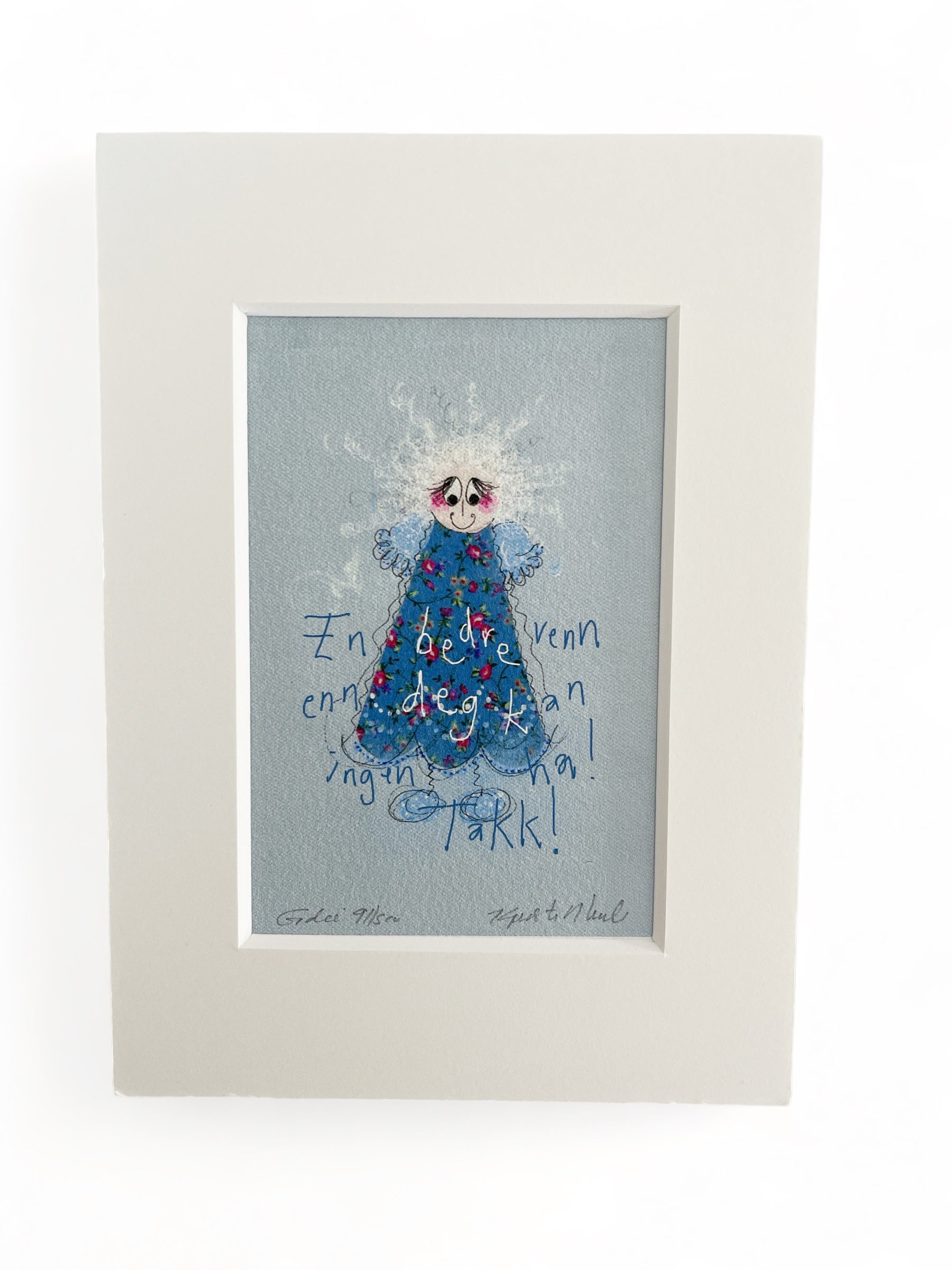 Teknikk: Håndkolorert Gicleè trykk. (Først males et maleri med blandede teknikker der det brukes akrylmaling, stoffer, tapeter, tegneblyanter, tusjer og penner. Maleriet trykkes deretter på en metode som heter «Gicleètrykk». Kunstneren godkjenner prøvetrykk før det trykkes. Når trykkene er ferdige, bearbeider kunstneren hvert enkelt trykk med å tegne og male oppå trykket igjen. Alle trykk blir med andre ord unike. Trykket signeres som håndkolorert trykk og er nummerert og signert.)