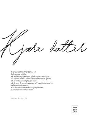 Plakat 1: Kjære datter du er elsket! Elsket for den du er! Du lyser opp mitt liv. Jeg ønsker deg kjærlighet, glede og takknemlighet. Må dagene dine ha balanse mellom sorger og gleder, slik at din takknemlighet blir stor. Må du lære deg verdien av deg selv og ditt dyrebare liv, og følge dine drømmer. Husk alltid at du er verdifull og høyt elsket! Og du er alltid velkommen hjem! (mamma og pappa)