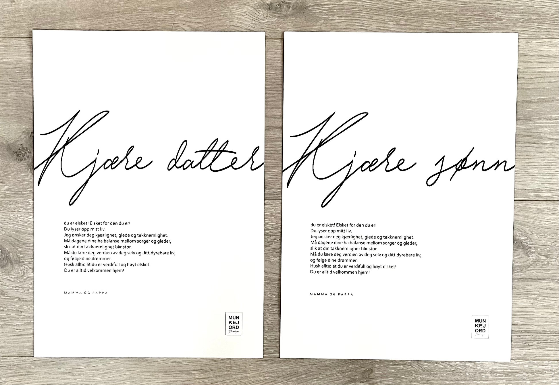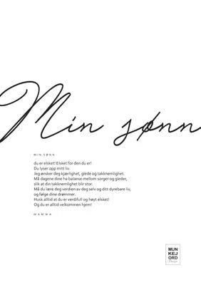 Plakat 2: Kjære sønn du er elsket! Elsket for den du er! Du lyser opp mitt liv. Jeg ønsker deg kjærlighet, glede og takknemlighet. Må dagene dine ha balanse mellom sorger og gleder, slik at din takknemlighet blir stor. Må du lære deg verdien av deg selv og ditt dyrebare liv, og følge dine drømmer. Husk alltid at du er verdifull og høyt elsket! Og du er alltid velkommen hjem! (mamma og pappa)