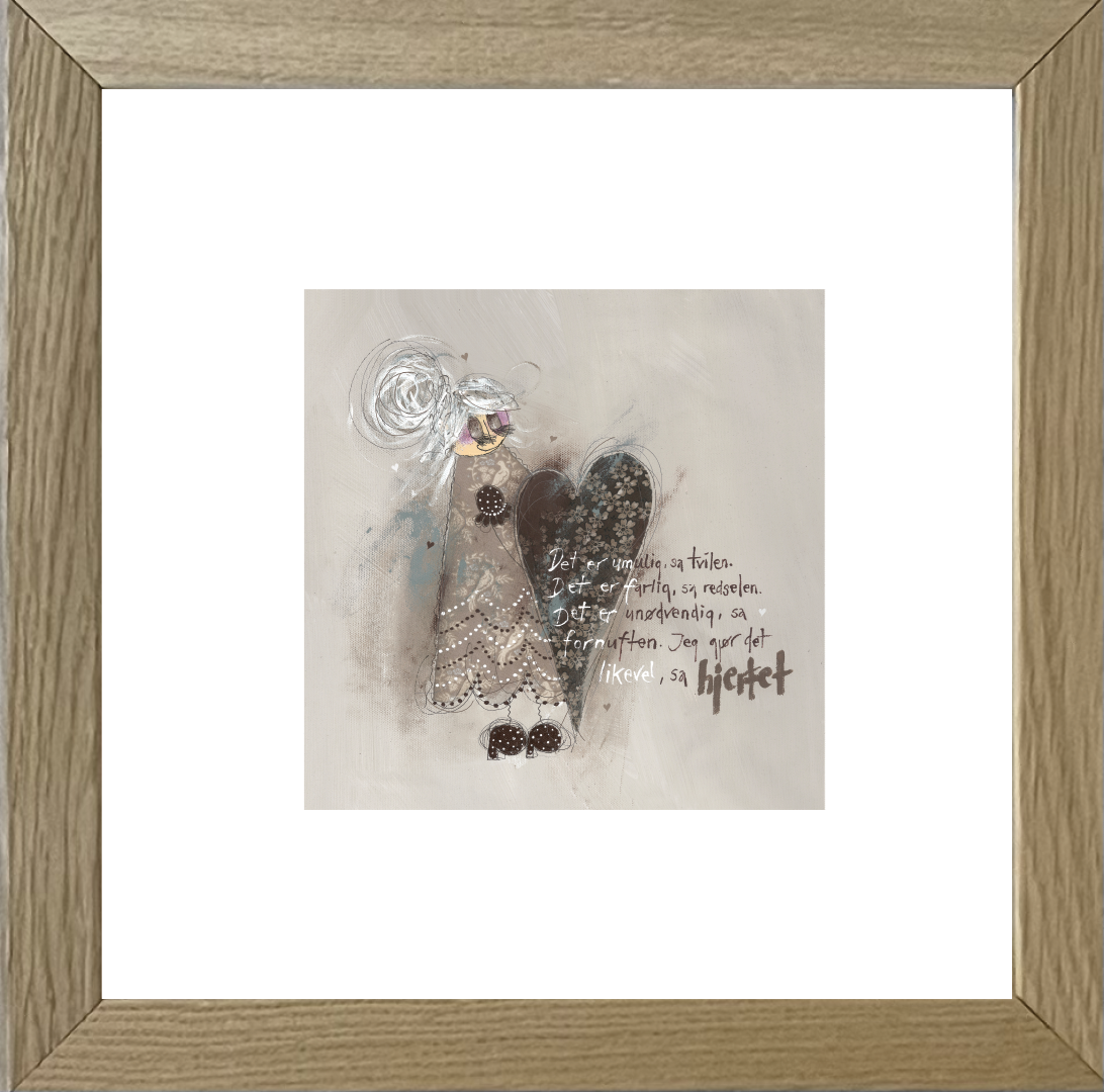 Kunsttrykket "Tvilen" ferdig innrammet i eikeramme. Størrelse på ramme er 20x20 cm og kunsttrykk 11x11 cm.