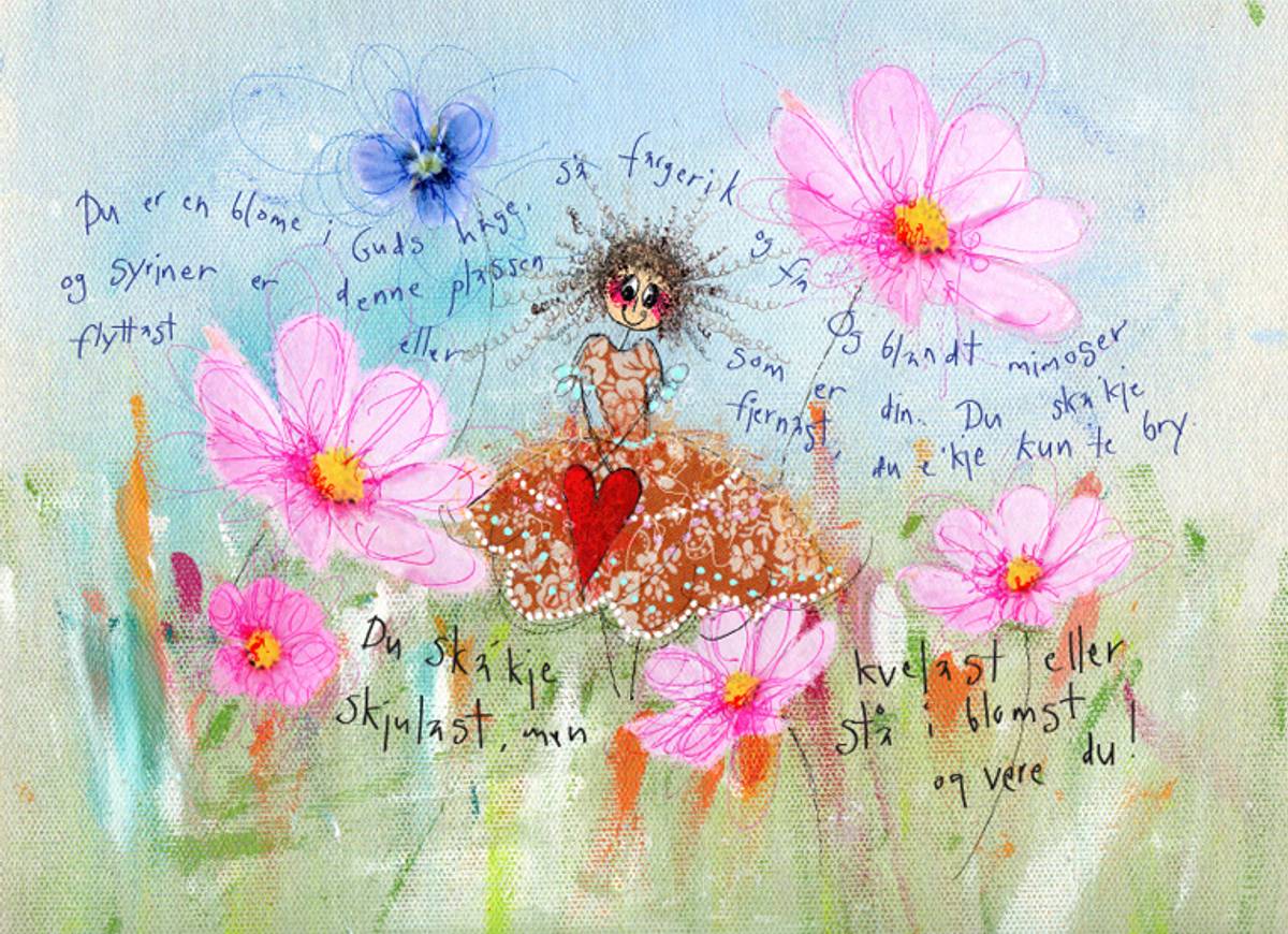 Tekst: Du er ein blome i Guds hage, så fargerik og fin. Og blandt mimosar og syriner er denne plassen som er din. Du ska`kje flyttast eller fjernast, du e`kje kun til bry. Du ska`kje kvelast eller skjulast, men stå i blomst og vere DU. (tekst av Sølvi Hopland)