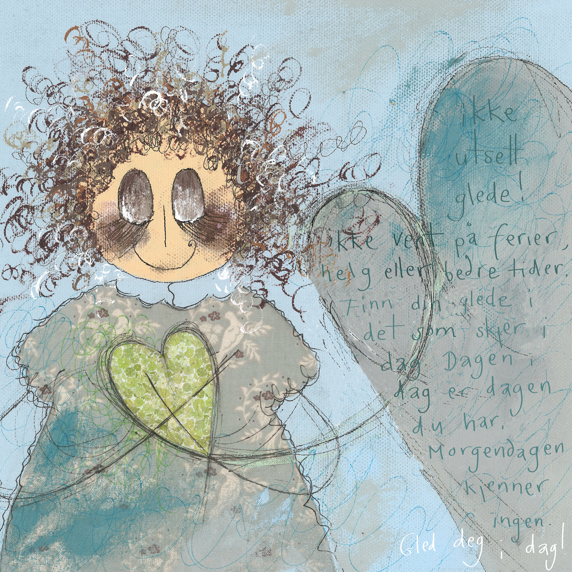 Tekst: Ikke utsett glede! Ikke vent på ferier, helg eller bedre tider. Finn din glede i det som skjer i dag. Dagen i dag er dagen du har. Morgendagen kjenner ingen. Gled deg i dag!