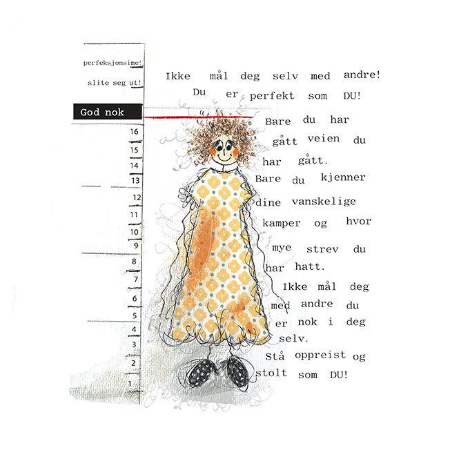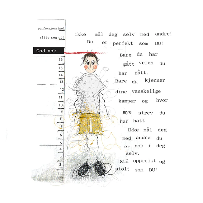 Tekst: Ikke mål deg selv med andre! Du er perfekt som DU! Bare du har gått veien du har gått. Bare du kjenner dine vanskelige kamper og hvor mye strev du har hatt. Ikke mål deg med andre, du er nok i deg selv! Stå oppreist og stolt som DU!