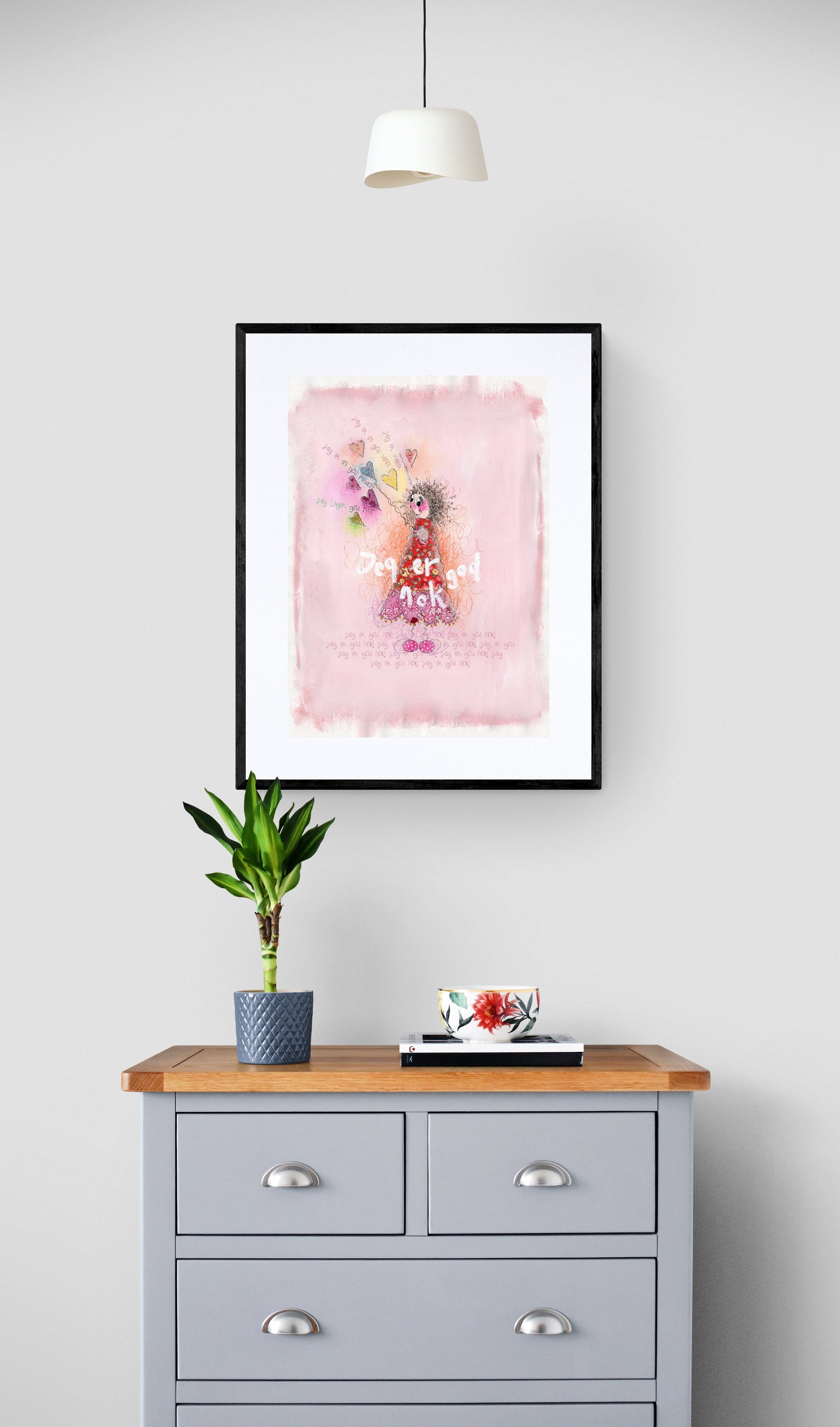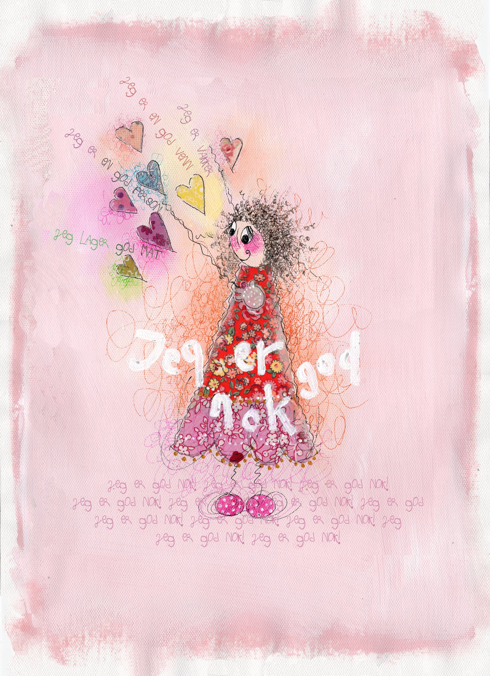 Dette kunsttrykket fra Kjersti Munkejord Lamb er en vakker og viktig påminnelse om egenverd. Med sitt enkle og kraftfulle budskap, "Jeg er god nok", oppfordrer dette bildet deg til å omfavne din egen verdi og akseptere deg selv akkurat som du er.