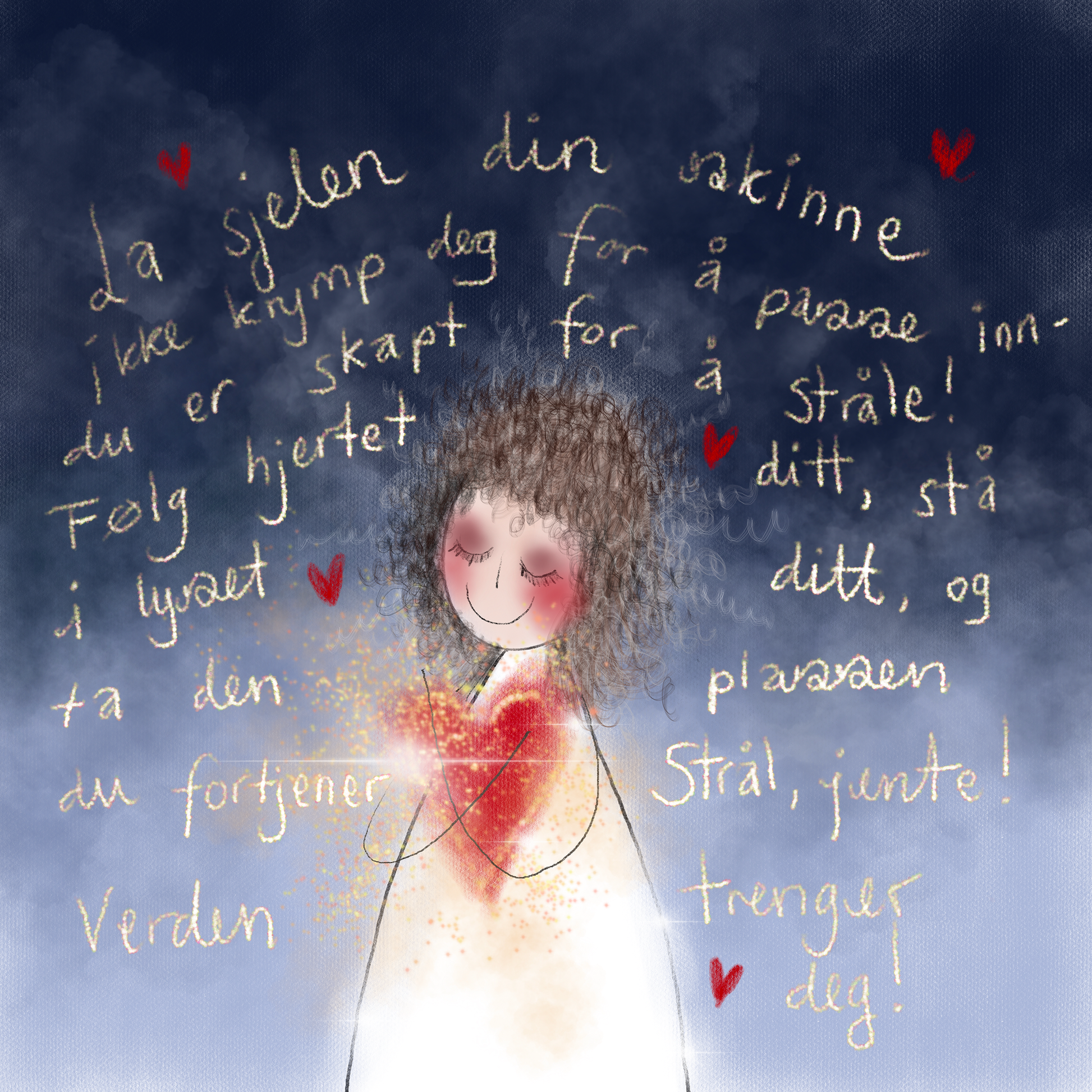 La sjelen din skinne. Ikke krymp deg for å passe inn, du er skapt for å stråle! Følg hjertet ditt, stå i lyset ditt, og ta den plassen du fortjener. Strål, jente! Verden trenger deg! 😇