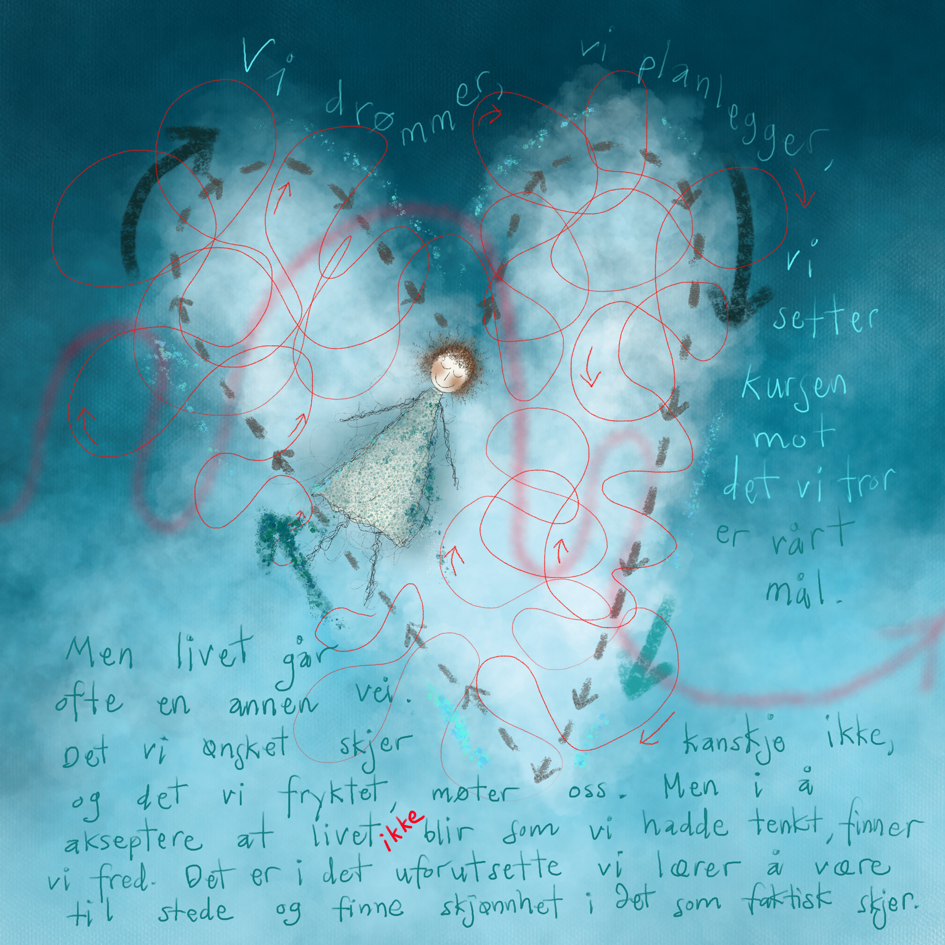 Vi drømmer, vi planlegger, vi setter kursen mot det vi tror er våre mål. Men livet går ofte en annen vei. Det vi ønsket skjer kanskje ikke, og det vi fryktet, møter oss. Men i å akseptere at livet ikke blir som vi hadde tenkt, finner vi fred. Det er i det uforutsette vi lærer å være til stede og finne skjønnhet i det som faktisk skjer.