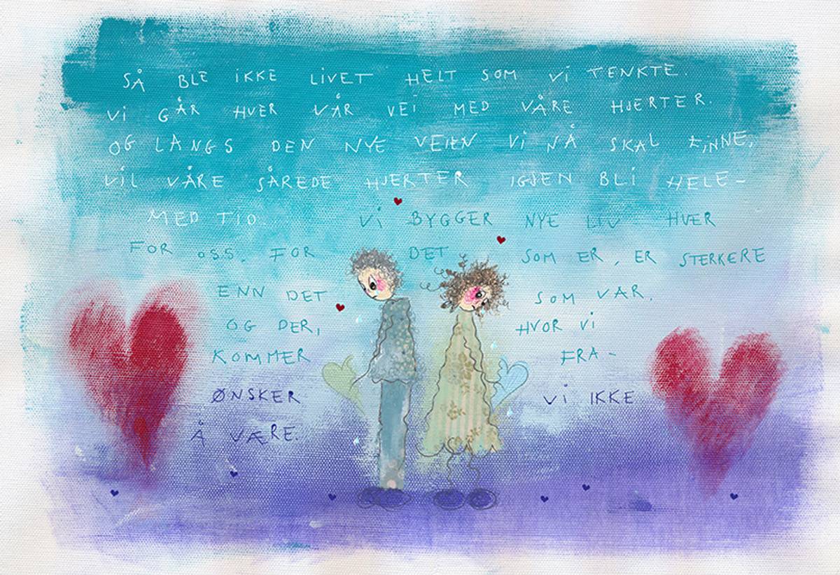 Tekst: Så ble ikke livet helt som vi tenkte. Vi går hver vår vei med våre hjerter. Og langs den nye veien vi nå skal finne, vil våre sårede hjerter igjen bli hele - med tid. Vi bygger nye liv hver for oss. For det som er, er sterkere enn det som var, og der hvor vi kommer fra, ønsker vi ikke å være.