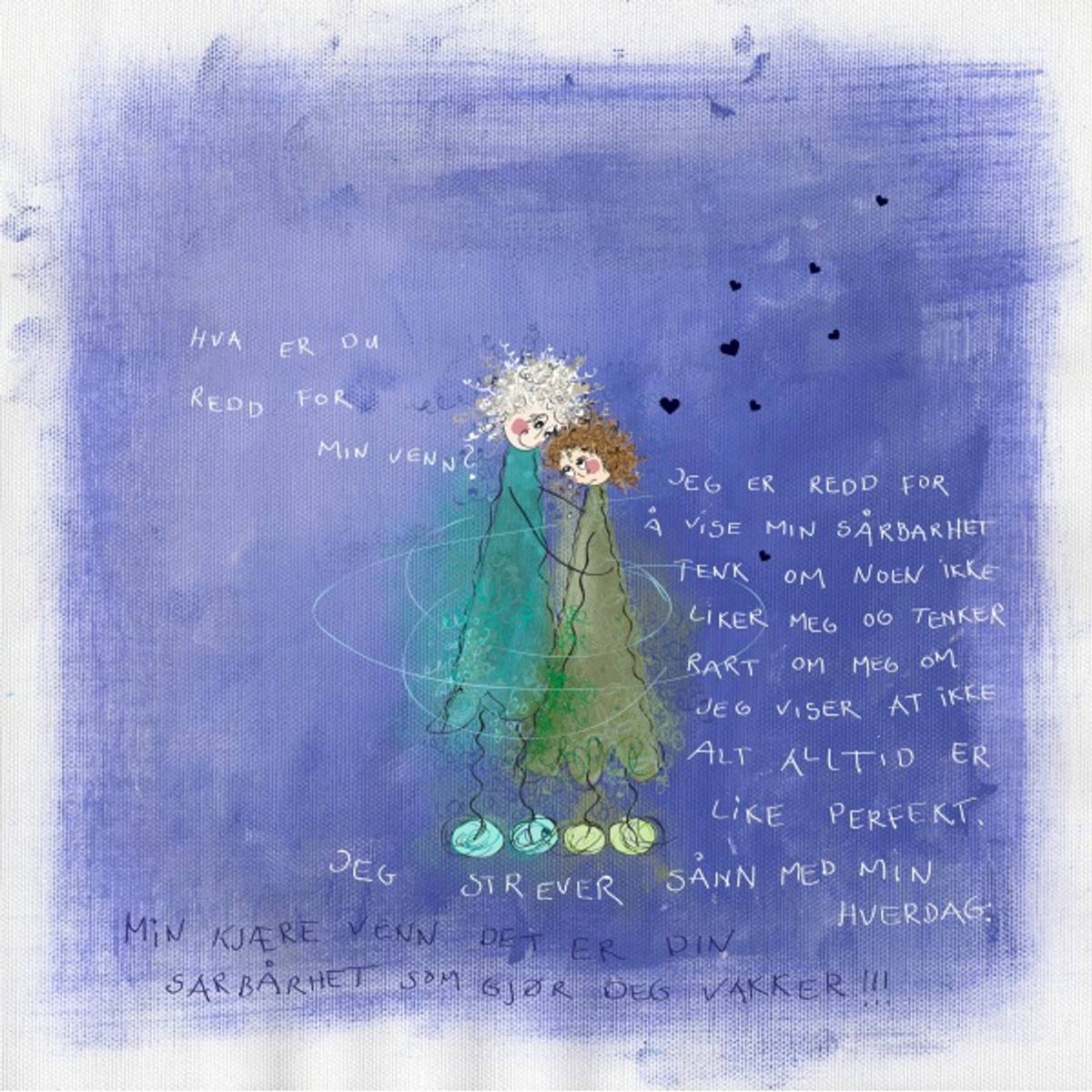 Tekst: Hva er du redd for min venn? Jeg er redd for å vise min sårbarhet. Tenk om noen ikke liker meg og tenker rart om meg om jeg viser at ikke alt alltid er like perfekt. Jeg strever sånn med min hverdag. Min kjære venn, det er din sårbarhet som gjør det vakker!