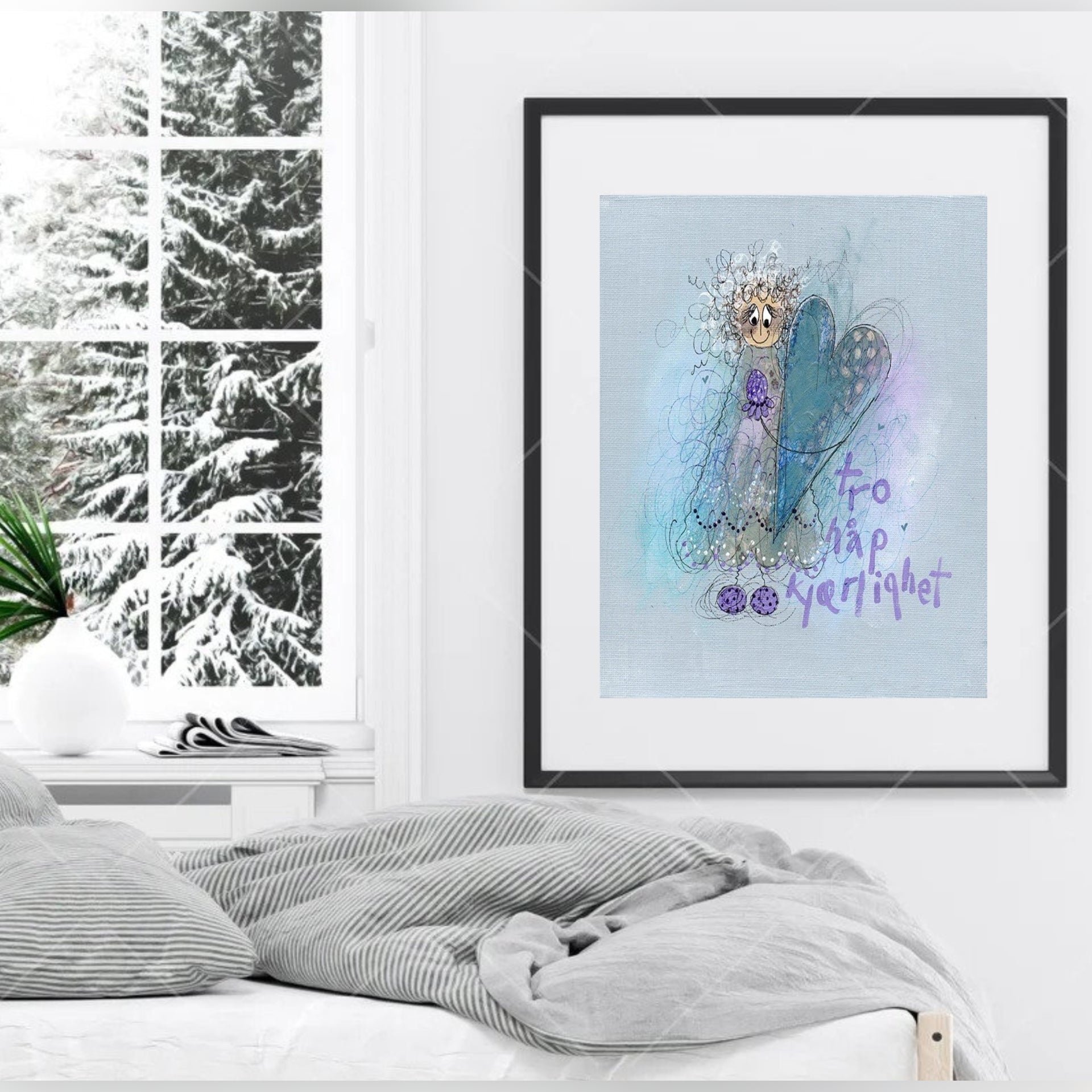 Teknikk: Håndkolorert Gicleè trykk. (Først males et maleri med blandede teknikker der det brukes akrylmaling, stoffer, tapeter, tegneblyanter, tusjer og penner. Maleriet trykkes deretter på en metode som heter «Gicleètrykk». Kunstneren godkjenner prøvetrykk før det trykkes. Når trykkene er ferdige, bearbeider kunstneren hvert enkelt trykk med å tegne og male på trykket igjen. Alle trykk blir med andre ord unike. Trykket signeres som håndkolorert trykk og er nummerert og signert.)