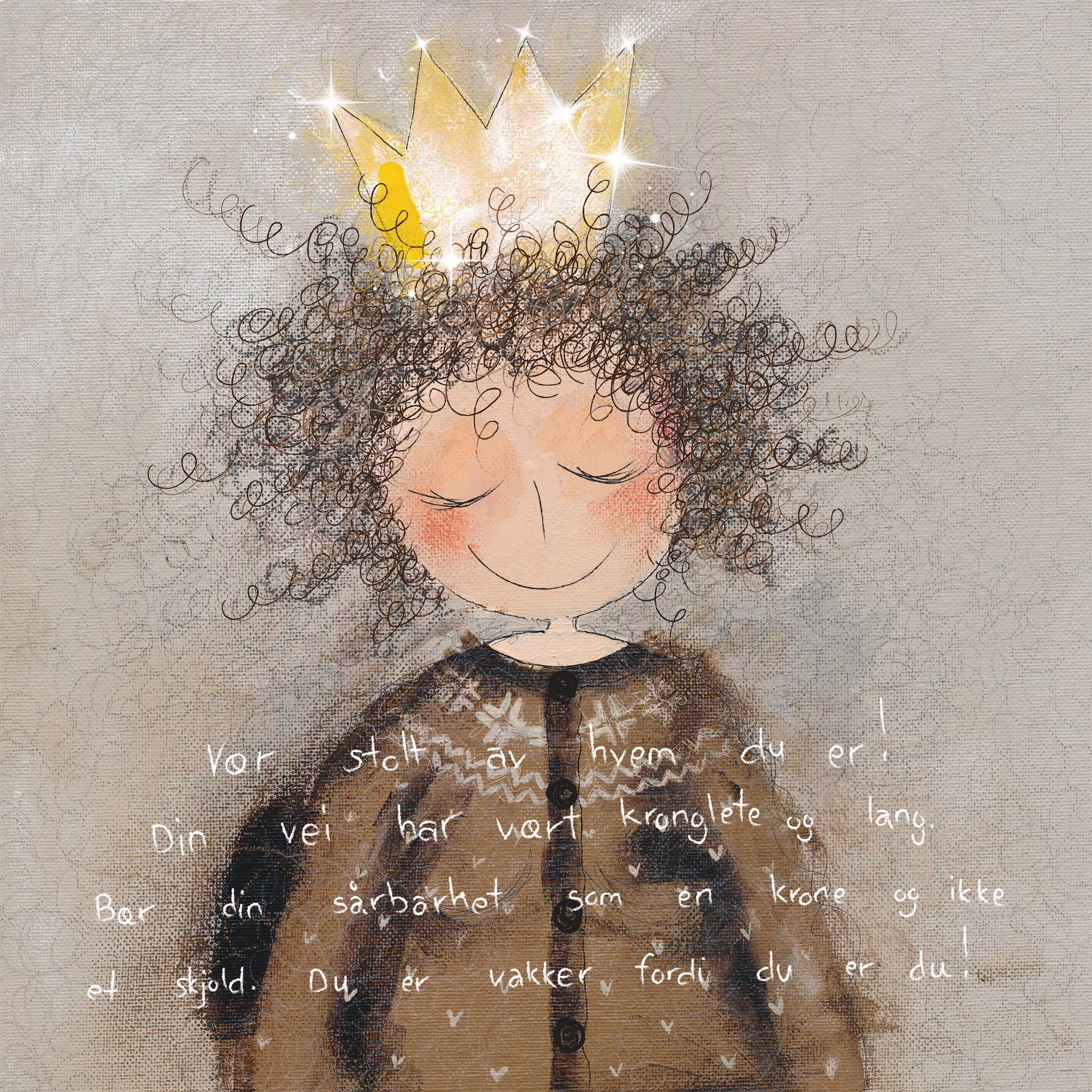 Tekst: Vær stolt av hvem du er! Din vei har vært kronglete og lang. Bær din sårbarhet som en krone og ikke et skjold. Du er vakker fordi du er du!